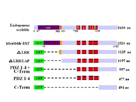 To map the domains that mediate its membrane localization, GFP-tagged scribble mutants were generated and expressed in WIF-B cells using recombinant adenoviruses. The localizations of the GFP-tagged scribble EST, and four progressive truncation mutants, DLRR, DLRR+LAP and the PDZ1-4 + C-Term (the C-terminal half of scribble that containing the four PDZ domains), and PDZ1-4 were similar to that of endogenous scribble: all five mutants were found at basolateral plasma membrane and in the tight junction region. However, the construct encoding the C-terminal region beyond the PDZ domain was soluble. These show that in polarized hepatocytes the C-terminal half of scribble with four PDZ domains plays a role in its PM localization. Current experiments focus on: a) identifying the localization signal(s) in the C-terminal half of scribble; and b) characterizing the proposed plasma membrane complex and identifying interacting molecules.